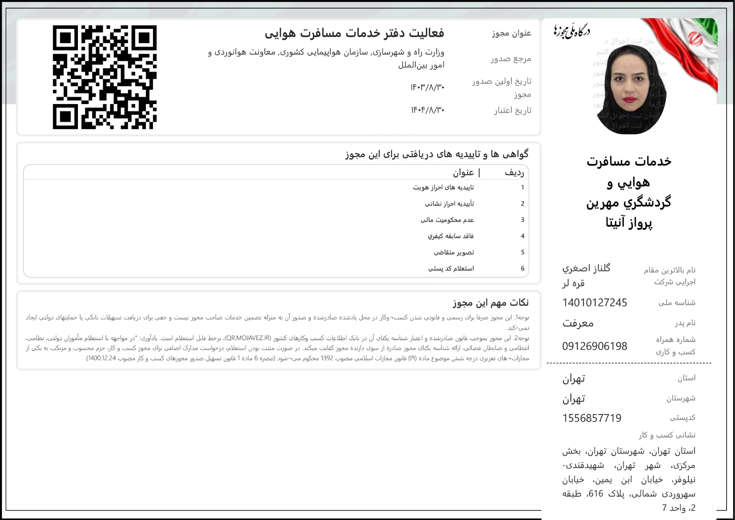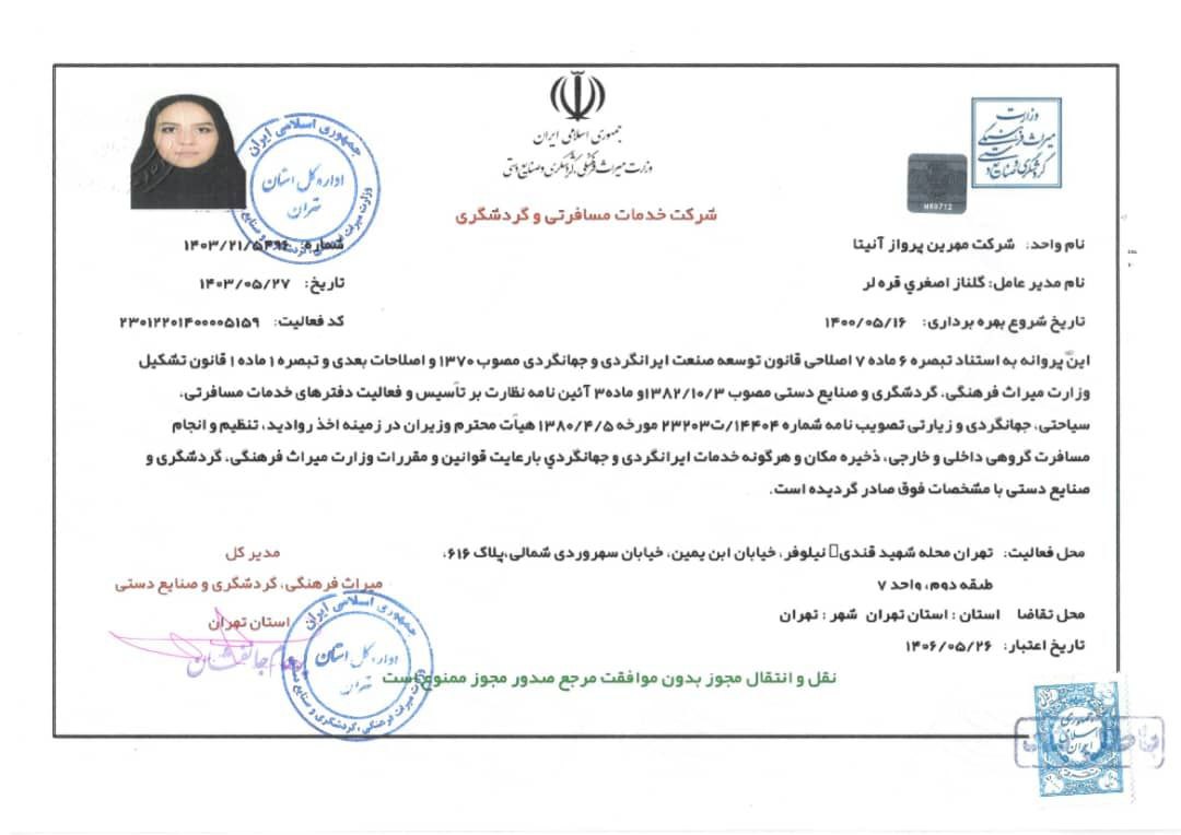 شرکت مهرین پرواز آنیتا علاوه بر داشتن مجوز بند “الف” از سازمان هواپیمایی کشوری ایران، دارای مجوز بند “ب” از سازمان گردشگری ایران نیز میباشد. این مجوز به شرکت مهرین پرواز آنیتا این امکان را میدهد که تورهای داخلی و خارجی را برگزار کرده و خدمات گردشگری متنوعی مانند تورهای تفریحی، فرهنگی، مذهبی و طبیعتگردی را به مسافران ارائه دهد. با این مجوز، مهرین پرواز آنیتا قادر است تا برنامهریزی و اجرای تورها را با کیفیت بالا و طبق استانداردهای سازمان گردشگری ایران انجام دهد و به مشتریان خود تجربهای ویژه و امن از سفرهای داخلی و خارجی را تضمین کند.